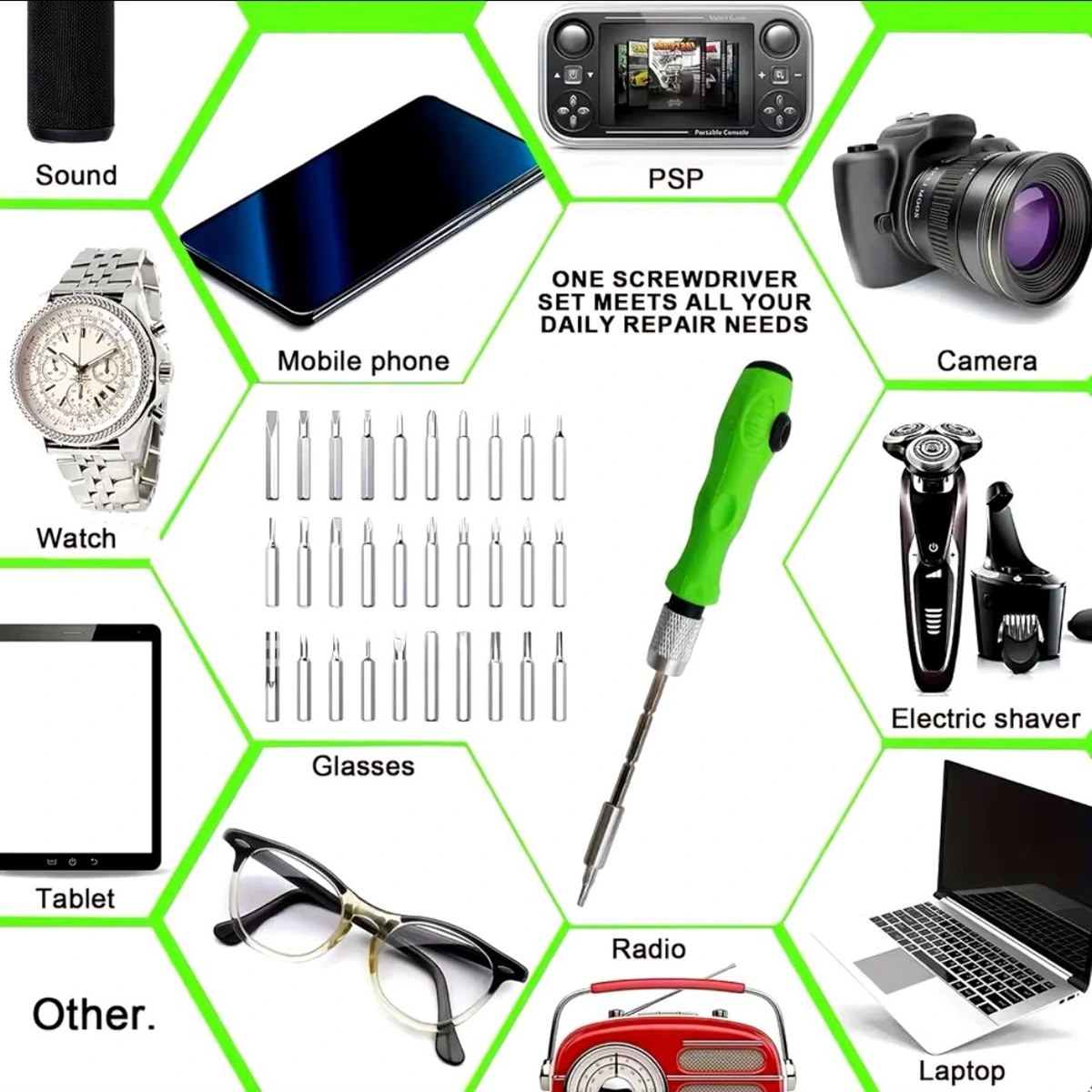 مجموعه پیچ گوشتی چند منظور پاور با 30 عدد سری مختلف و قابل تطبیق با کار در زمینه های مختلف. از فولاد کروم وانادیوم با کیفیت بالا ساخته شده است. طول قابل تنظیم دسته باعث می شود کارهای مختلف را به راحتی انجام داد.این پیچ گوشتی ها دارای طراحی ارگونومیک بوده و به طور گسترده برای اکثر محصولات دیجیتال مانند کامپیوتر، تلفن همراه، دوربین، عینک و ساعت استفاده می شود.