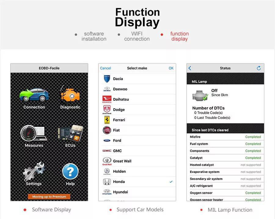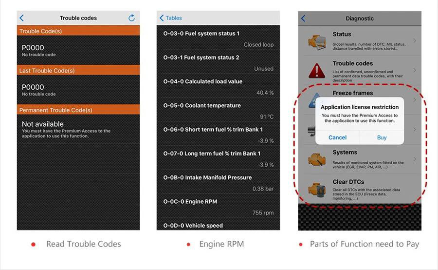 1.Read diagnostic trouble codes, both generic and manufacturer-specific, and display their meaning (over 3000 generic code definitions in the database).