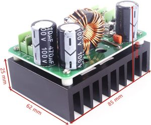 مبدل DC به DC یک مدار الکترونیکی است که منبع جریان مستقیم (DC) را از یک سطح ولتاژ به سطح دیگر تبدیل می کند. مبدل های DC-DC به طور گسترده ای برای تولید ولتاژ تنظیم شده از منبع استفاده می شود . این ماژول نیز یک افزاینده ولتاژ می باشد که ولتاژ 10 الی 60 ولت DC را به 12 الی 80 ولت DC تبدیل می نماید همچنین جریان کاری این ماژول نیز 10 آمپر می باشد .