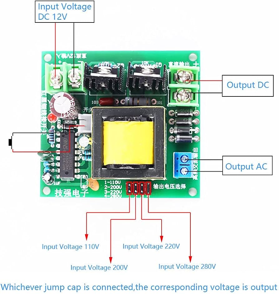• این برد دارای خروجی AC موج مربعی فرکانس بالا و خروجی DC است، بنابراین نمی تواند وسایل الکتریکی القایی (مانند موتور، فن، خازن مقاومت، درایوهای افت ولتاژ، چراغ های LED کوچک و غیره) را هدایت کند.