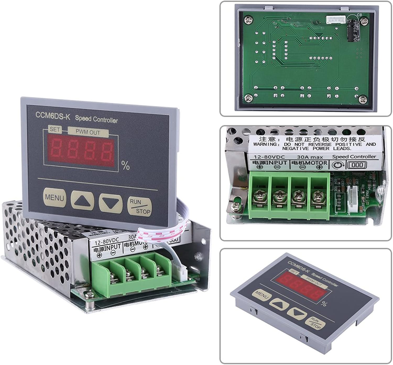 اصول کار: گاورنر کنترلر سرعت موتور DC 12-80V PWM 30A با نمایشگر دیجیتال، رگولاتور کنترل سرعت متغیر بدون پله با کلید دکمهای، شروع آهسته و توقف آهسته. ولتاژ ورودی میتواند ۱۲ ولت DC تا ۸۰ ولت باشد و ولتاژ خروجی از ولتاژ ورودی است. اطلاعات دقیق: ولتاژ ورودی: DC 12V-80V، ولتاژ خروجی: از ولتاژ ورودی، حداکثر جریان: 30A، فرکانس PWM: 21kHz، محدوده سرعت: . مطمئن شوید که قطب مثبت و منفی به درستی وصل شده است، در غیر این صورت کنترلر آسیب خواهد دید.