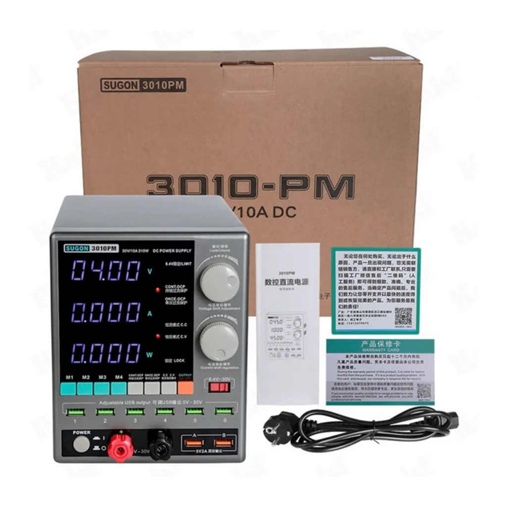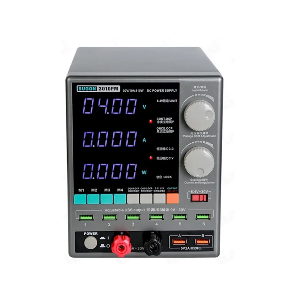 این منبع تغذیه SUGON 3010PM حرفهای دارای 6 خروجی USB قابل تنظیم و متغیر به همراه 2 خروجی ثابت 5 ولت 2 آمپر است که در مجموع 8 خروجی را فراهم می کند. از دیگر قابلیت های مهم آن میتوان به محدودکننده ولتاژ بین 8.4 ولت و 30 ولت، قابلیت قطع خروجی ولتاژ توسط کلید، محافظ جریان، قفل ولتاژ، قابلیت شورت کیلر و کالیبره اشاره کرد. همچنین وجود صفحه نمایش LCD با وضوح بالا تجربه کاربری دقیقتری را فراهم می کند. اقلام همراه دستگاه شامل کابل پاور فوق العاده با کیفیت و پراب منبع می باشد.