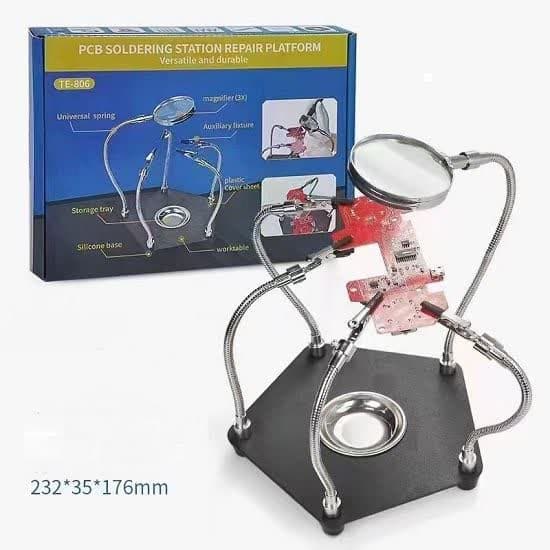 گیره مونتاژ ذرهبین حرفهای TE-806 یک ابزار چندمنظوره و کاربردی برای تعمیرکاران الکترونیک، علاقهمندان به لحیمکاری، و افرادی است که با قطعات ریز و حساس کار میکنند. این ابزار با طراحی دقیق و امکانات متنوع، امکان انجام کارهای دقیق و بدون نیاز به دستهای اضافی را فراهم میکند.
