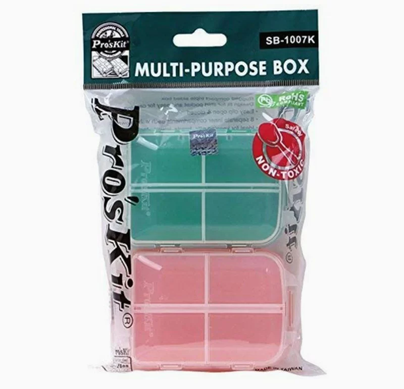 جعبه ابزار چند منظوره پروسکیت دارای طراحی مناسب برای جیب پیراهن و آسان برای حمل میباشد. از جمله امکانات این جعبه چند منظوره میتوان به باز و بسته شدن راحت، 8 قطعه داخلی جداگانه با درب های جداگانه ، ساخته شده از مواد غیر سمی و ایده آل بودن برای نگه داشتن قرص ، قطعات الکترونیک ، مهره ، جواهرات و… اشاره کرد.