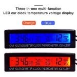 ساعت دیجیتال ۳ کاره خودرو: ساعت دیجیتال، دماسنج، ولت سنج خودرو قابلیت سنجش دمای داخل و خارج خودرو و نمایش با دو واحد سیلسیوس و فارنهایت دارای هشدار دمای یخ زدگی نمایش ولتاژ لحظه ای باتری خودرو به همراه آلارم هشدار کاهش و افزایش بیش از حد چراغ پس زمینه آبی و نارنجی مناسب برای تمامی خودروها باولتاژ ۱۲ و ۲۴ ولت
